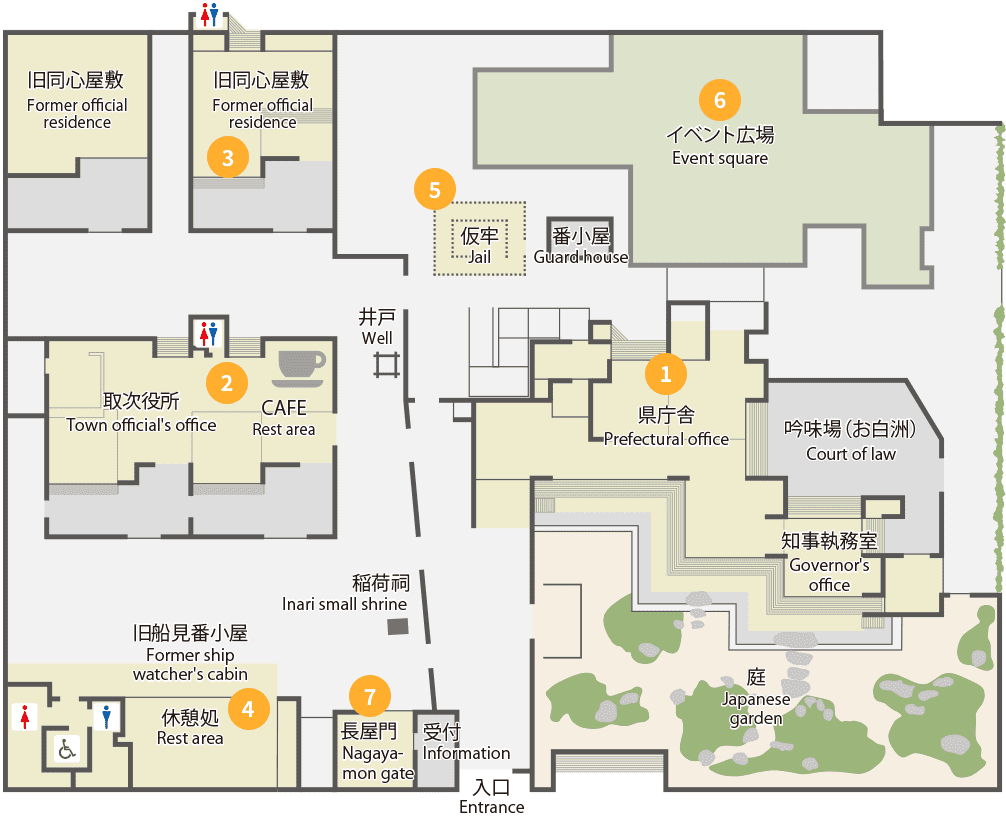 当時の知事執務室を含む県庁舎、旧同心屋敷などが再現されており、歴史空間を体感できます。